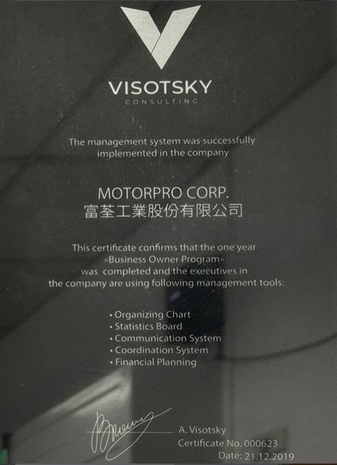 Motorpro holds ISO-9002, QS-9000, and ISO/TS16949 international quality certifications, with a TÜV NORD ISO9001:2015 certified facility in Taiwan.